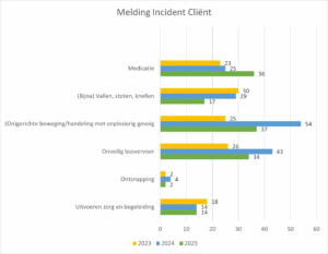 Binnen de categorie ‘(on)gerichte handeling met onplezierig gevolg’ kwam een groot deel van de meldingen bij de cliënten van één volwassene met snelle onrust. Door intensieve monitoring en regelmatige bespreking in het MDO is het aantal incidenten aan het afnemen.