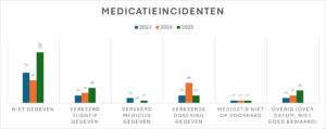 Veiligheid blijft een belangrijk aandachtspunt binnen Omega. In 2024 en 2025 steeg het totaal aantal meldingen ten opzichte van eerdere jaren. Bij medicatie‑incidenten ging het vaak om medicatie die vergeten werd, waarbij factoren zoals drukte op de groep, inzet van onbekende invallers, verminderde alertheid of de start van een nieuw medicijn een rol speelden. De coördinerend verpleegkundige beoordeelt alle meldingen en bespreekt ze waar nodig met teams.